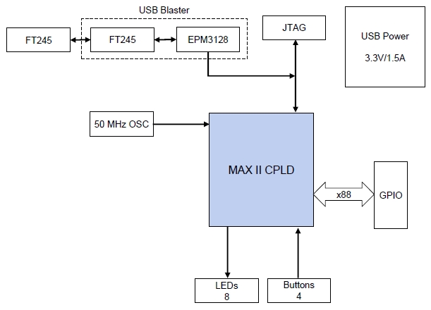 Цифровая инженерная лаборатория в ваших руках. Оснащенный ПЛИС CPLD EPM2210F324C3 серии MAX II и внутрисхемным загрузчиком USB-Balaster, комплект MAX II Micro предоставляет пользователю по настоящему мощный и эффективный инструмент разработки приложений на базе ПЛИС CPLD. Плата MAX II Micro может использоваться также в качестве программатора (только в режиме JTAG) благодаря интегрированной схеме загрузчика USB-Blaster.